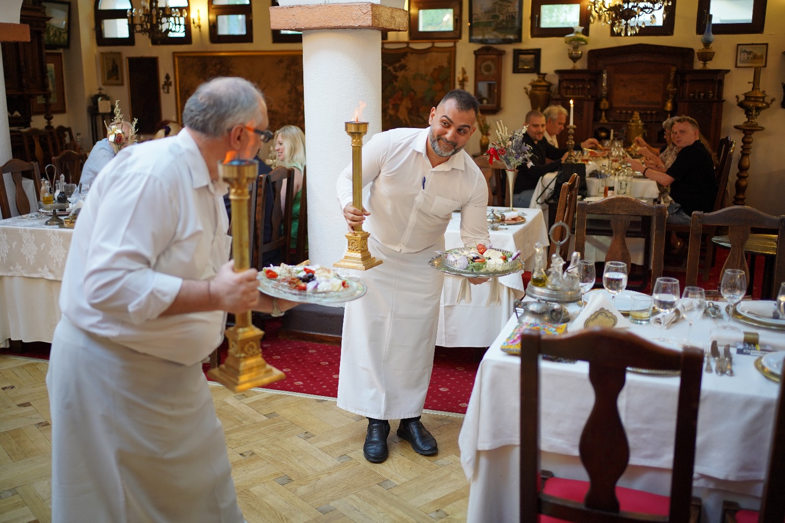 dintr-o benchetuială întâmplătoare un banchet franțuzit dar într-un decor brâncovenesc sclivisit, încărcat cu tapiserii de epocă, tablouri dintr-o pinacotecă rară și piese de mobilier ivite din mânurile ebeniștilor cu ștaif,